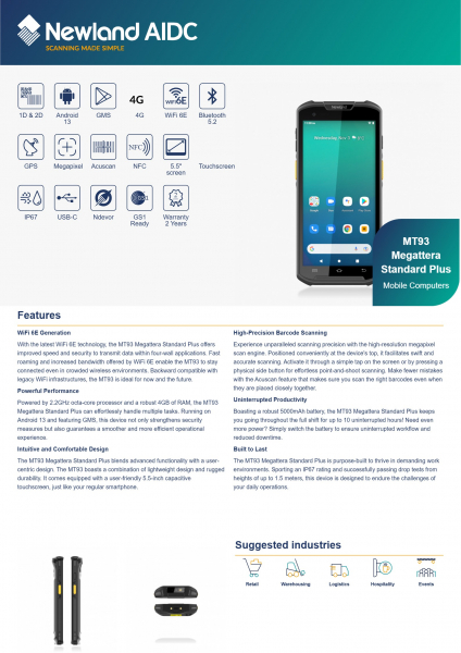 Newland MT9300 Standard Plus je zmogljiv mobilni računalnik, zasnovan za zahtevne poslovne aplikacije in terenske dejavnosti. Z velikim 5,5-palčnim zaslonom na dotik omogoča enostavno upravljanje in odličen pregled podatkov, medtem ko njegova robustna zasnova zagotavlja zanesljivo delovanje v različnih delovnih okoljih.