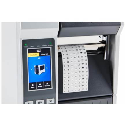 Label printer, industrial printer, thermal transfer, 24 dots/mm (600 dpi), media width (max.): 114 mm, print width (max.): 104 mm, roll diameter (max.): 203 mm, display (touch screen, colour), real time clock, USB (type B), USB Host, RS232, Bluetooth, Ethernet, RAM: 1 GB, Flash: 2 GB, emulation: ZPL, ZPLII, XML, incl.: power cable (EU, UK), order separately: interface cable